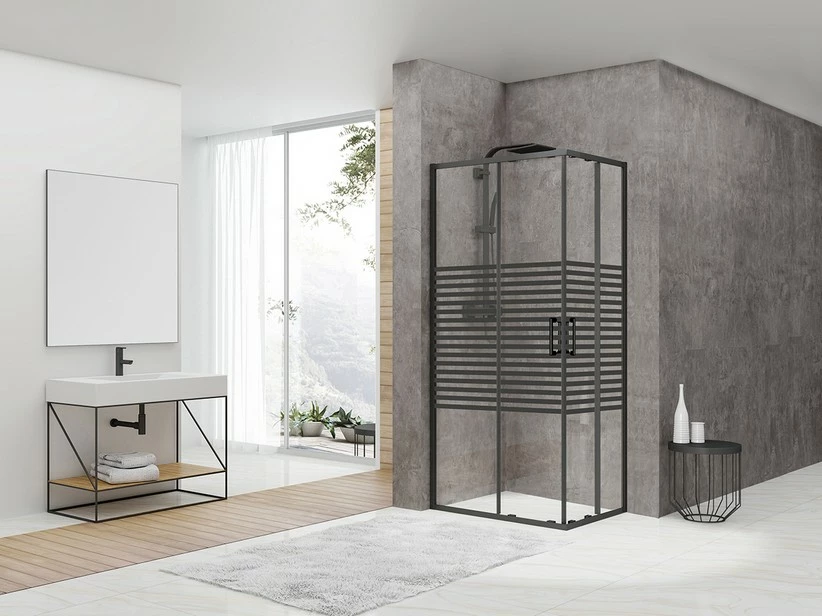 Cristallo spessore 6mm. trasparente con serigrafia a bande nere opache orizzontali esterne al box doccia