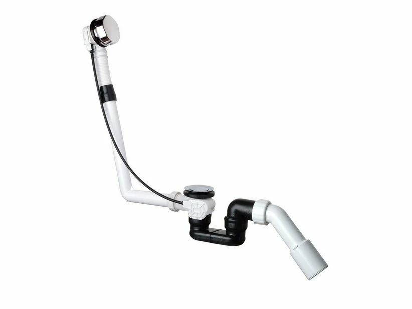 Colonna vasca sifonata ø 70 mm x 1″1/2 con sifone orientabile ribassato, comando a cavo, tubo flessibile, parti a vista in metallo cromato