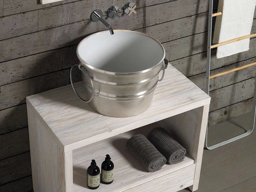 Bacile lavabo-lavatoio design cm.ø46,5 profondo h30 cm. con 2 anelli portasciugamano laterali in ottone cromato