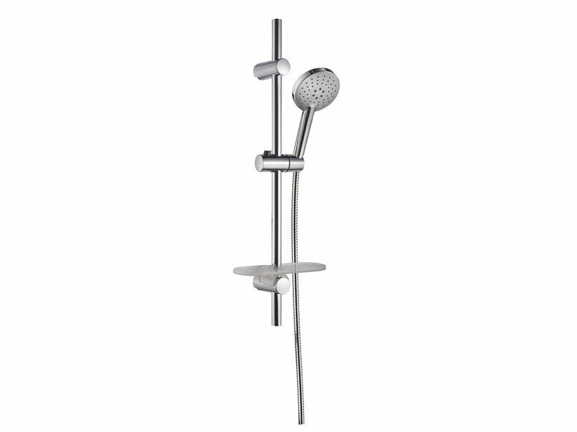 SANDRA asta saliscendi cm. 70 ø 22 mm con supporti a interasse variabile, flessibile e doccetta abs 3 getti con sistema a pulsante, mensola portasapone con finitura cromo