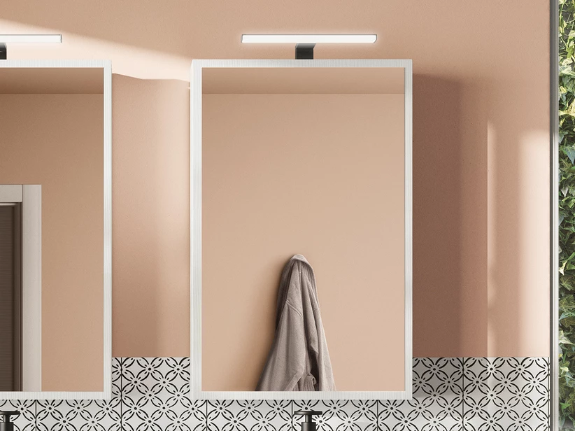 QUBO specchio contenitore verticale con 3 ripiani interni in cristallo – anta soft-close reversibile (apertura destro o sinistro) – finitura effetto legno bianco matrix