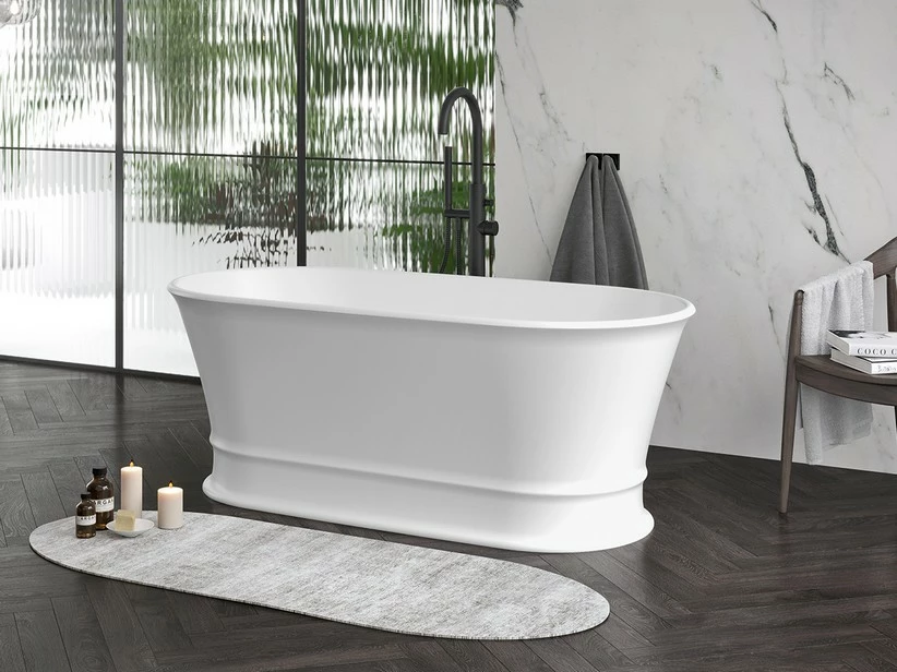 OLYMPIA vasca free-standing cm L160xP78,5xH61,5 senza troppo pieno e senza fori per rubinetteria. Piletta click clack inclusa. Piedini regolabili inclusi. – realizzata in Technosolid BIANCO OPACO